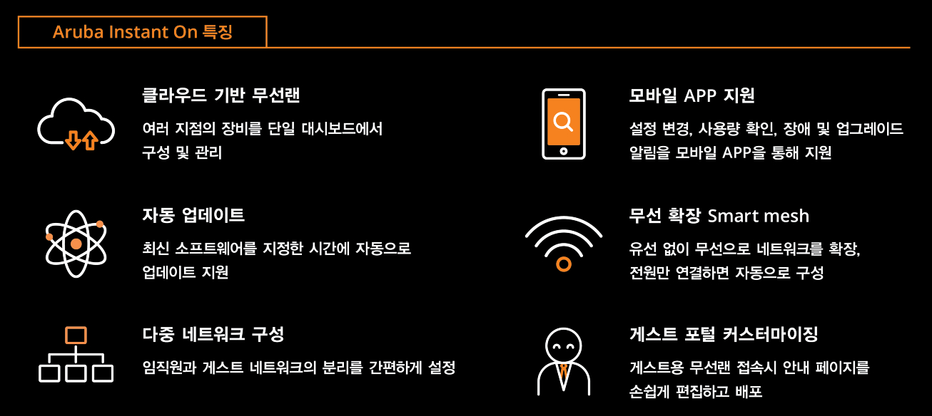 Aruba Instant On의 큰 특징은 아래 사진처럼 6가지를 꼽을 수 있고, 아래에서 풀어서 설명드릴게요~