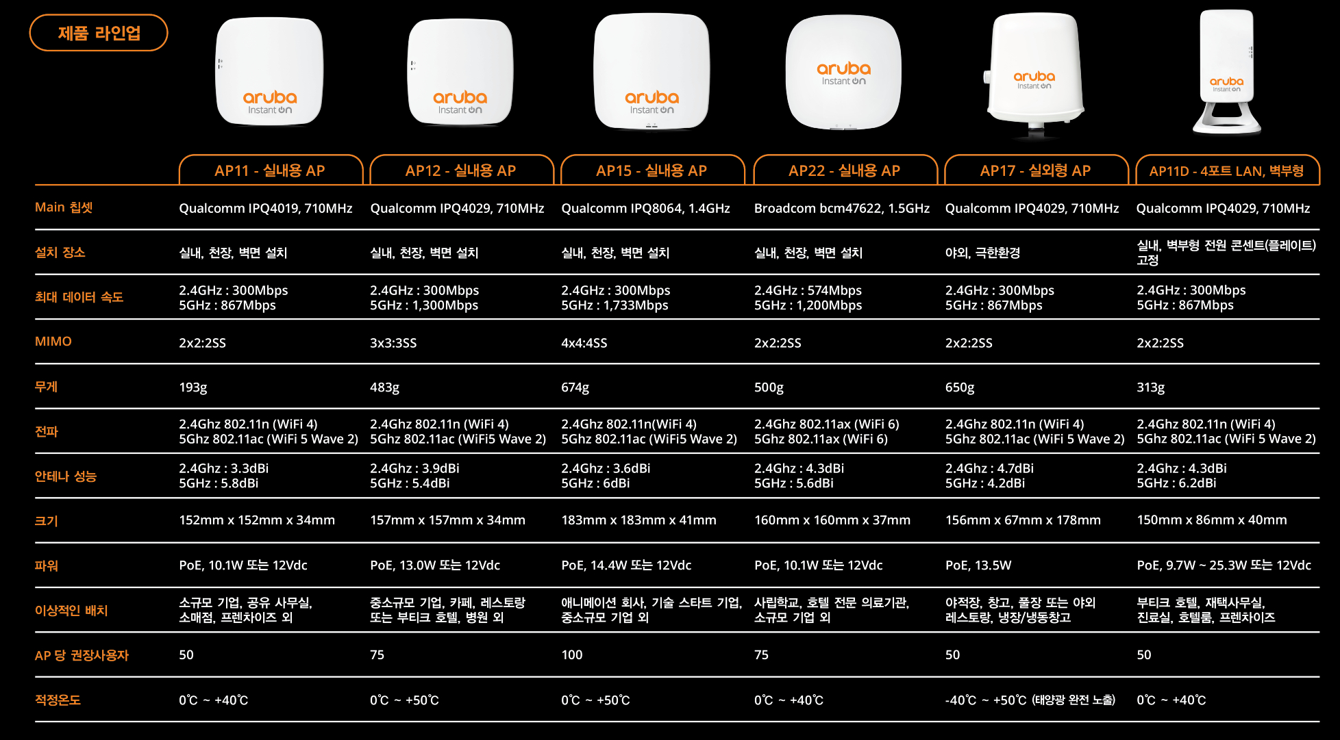 그리고 HPE Aruba Instant On 제품 라인업은 아래와 같습니다.