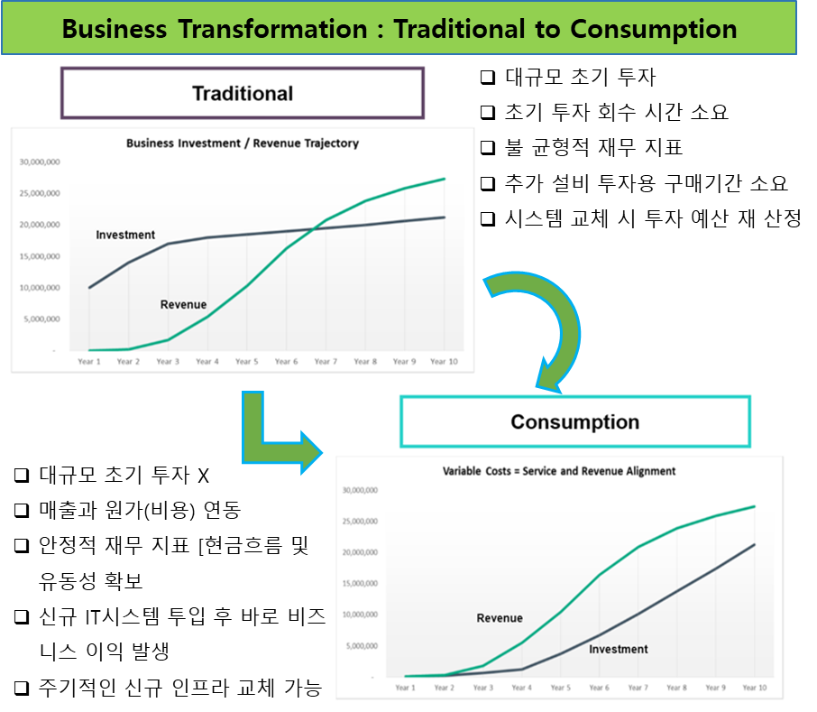 위의 사진에서 보시다시피, 전통적인 온프레미스와 Consumption 모델의 가장 큰 차이를 보이는 부분은 초기 투자 비용인데요.