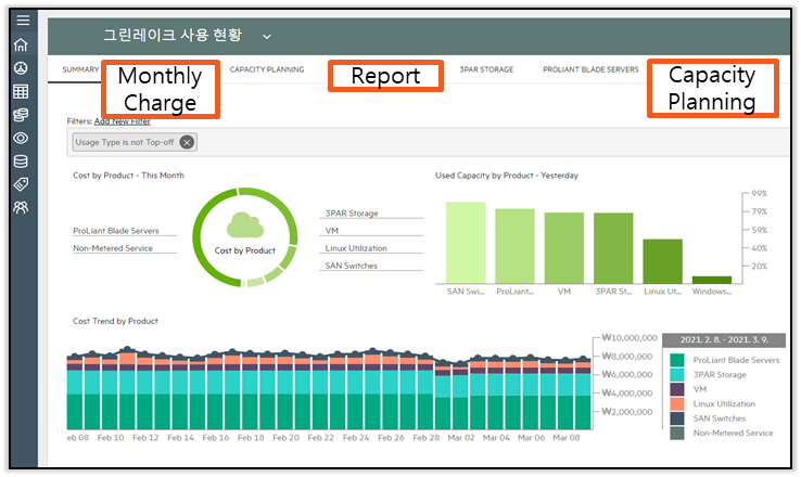 전체 인프라의 사용 현황 뿐만 아니라, 각 부서별 인프라 사용량/ 변동추이까지 가능하며,